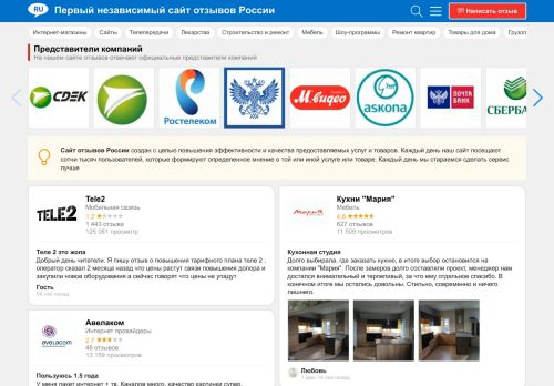 Лучший сайт отзывов среди всех которые мне встречались в сети. Один из важных преимуществ это то, что на любой отзыв на Сайте отзывов России отвечает ... Di più Лучший сайт отзывов среди всех которые мне встречались в сети. Один из важных преимуществ это то, что на любой отзыв на Сайте отзывов России отвечает официальный представитель компании на которую был добавлен отзыв. А это в свою очередь означает, что я был услышан и мой отзыв попал по адресу.